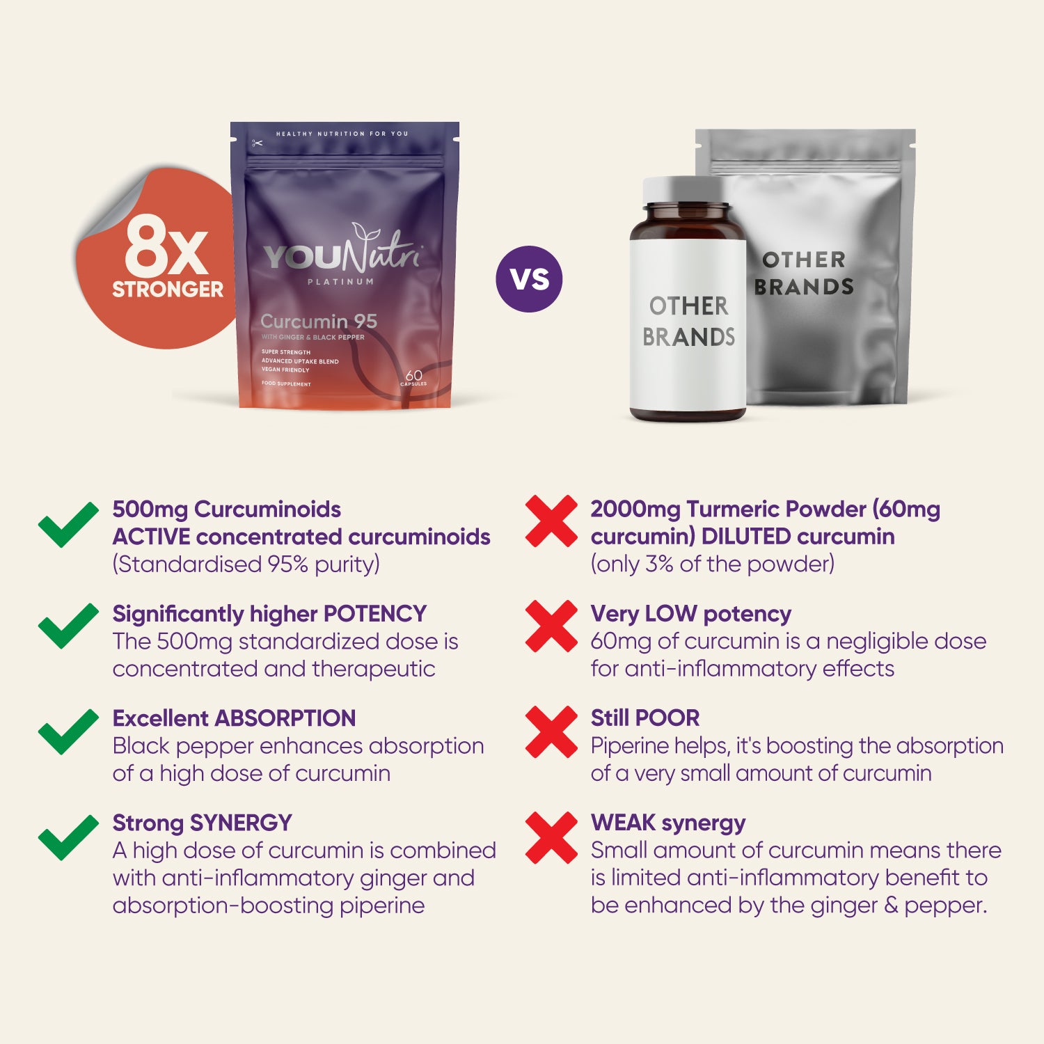 While most turmeric supplements contain only 2,000 mg of basic spice powder ā providing less than 100 mg of active curcuminoids ā each serving of YouNutri Curcumin 95 provides 500mg of 95% curcuminoids, equivalent to 12,500 mg of raw turmeric.