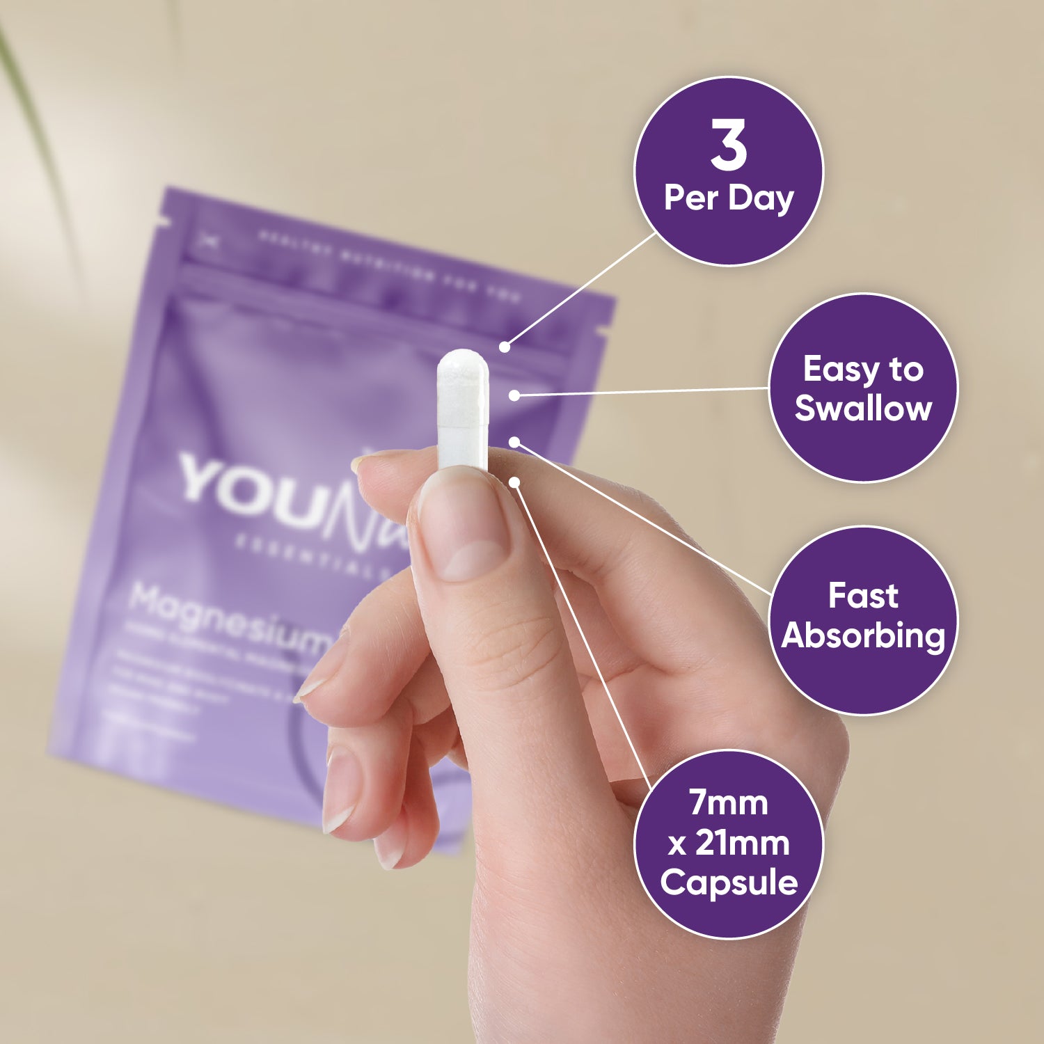 Each 3-capsule daily serving delivers 300mg of elemental magnesium, aligning with the NHS guideline for safe and effective daily intake.